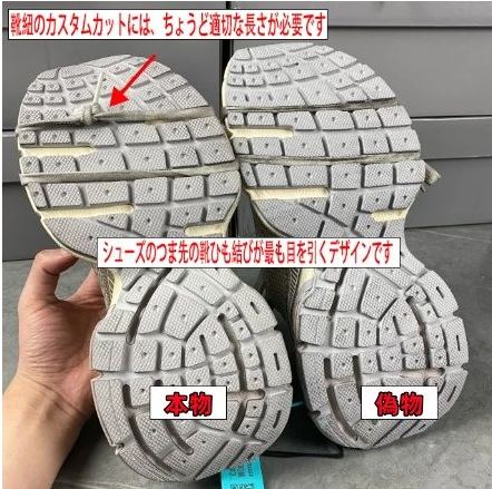 偽物:細めの安っぽいシューレースで、チップのメッキ剥がれがある