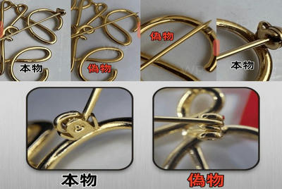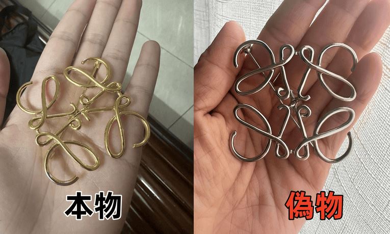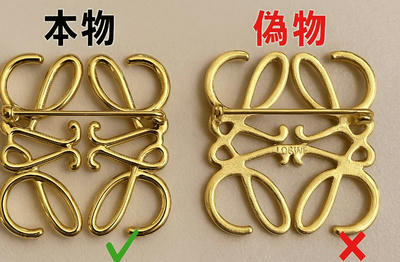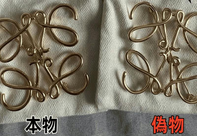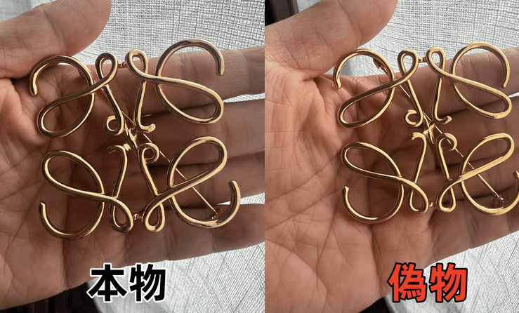 本物のロエベブローチは、金属部分の仕上げが非常に丁寧で、滑らかな質感と上品な光沢を持っています。エッジや曲線の部分は精緻に研磨され、高級感があります。偽物では、表面にザラつきがあり、仕上げが粗いことが多いです。また、金属光沢が鈍く、安っぽく見える場合があります。細部の作り込みにも差があり、本物は自然な立体感が感じられるのに対し、偽物は平坦で単調に見えることが多いです。