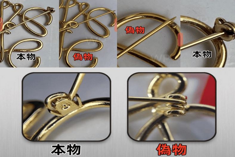 ブローチの留め具(ピン)の作りも、偽物と正規品を見分ける大切なポイントです。本物のロエベブローチは、ピンの先端が安全に隠れるように設計されており、開閉がスムーズでしっかりと固定されます。バネの強度も適切で、簡単に緩んだり外れたりすることはありません。偽物では、ピンの先端が飛び出していることがあり、開閉が固い、または不安定な場合があります。留め具の作りが雑だと、着用中に外れてしまうリスクが高まります。